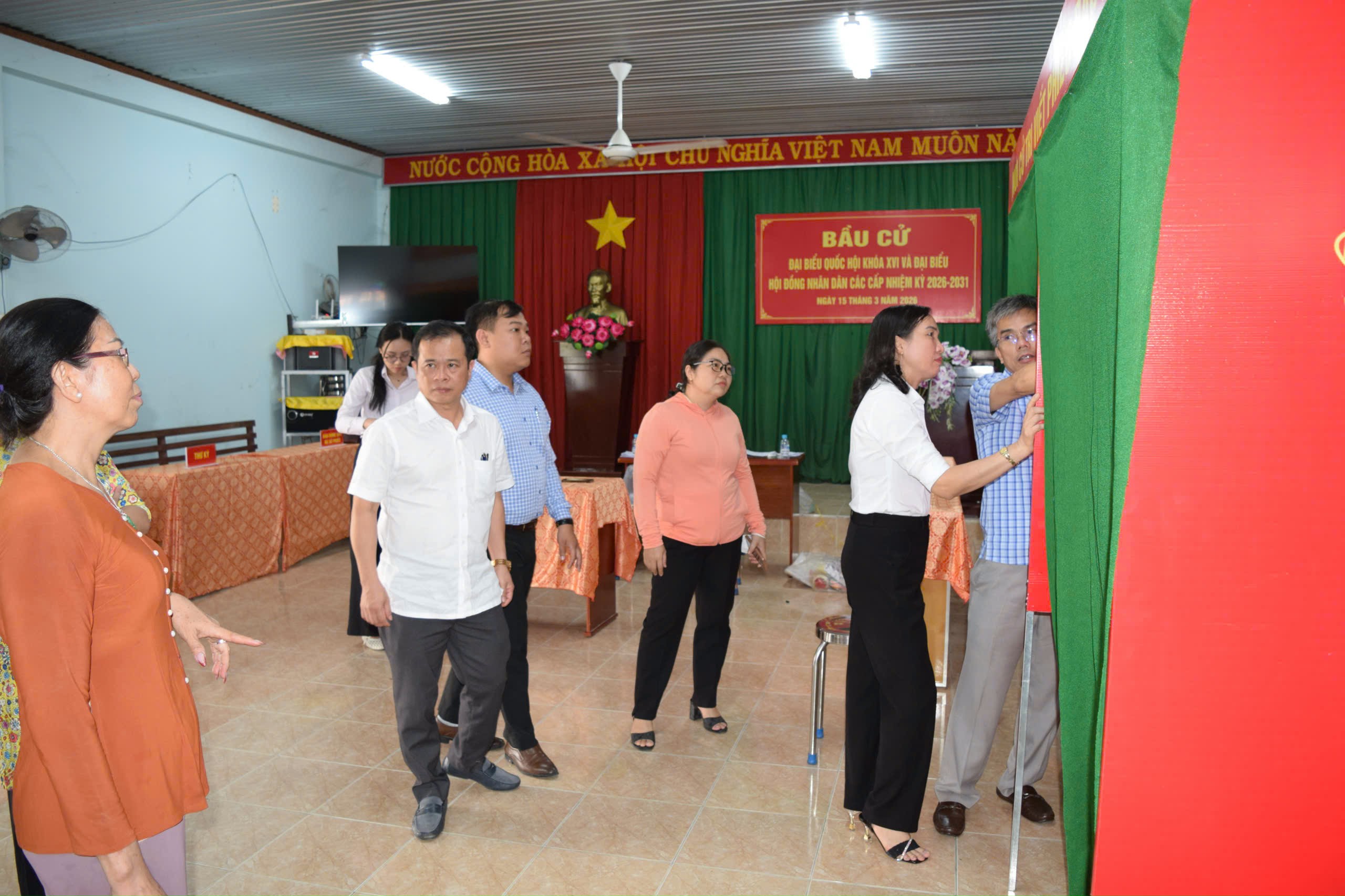 Tại buổi kiểm tra, Đoàn đã khảo sát thực tế tại 02 khu vực bỏ phiếu trên địa bàn xã Hưng Thịnh gồm ấp Hưng Phát và ấp An Hòa; đồng thời kiểm tra công tác chuẩn bị cơ sở vật chất, trang trí khu vực bỏ phiếu...