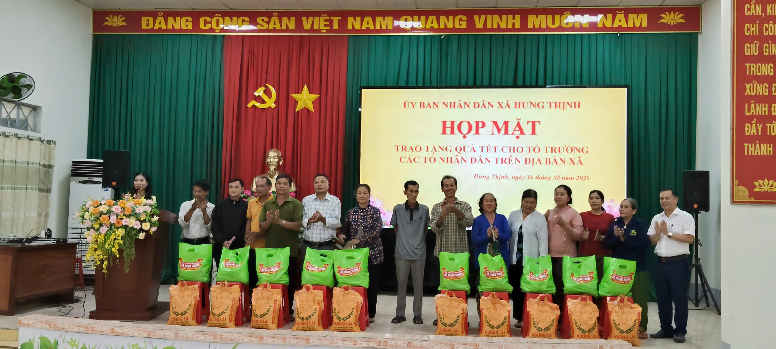 Chiều ngày 10/02/2026, xã Hưng Thịnh đã tổ chức họp mặt và trao tặng quà Tết cho các Tổ trưởng Tổ nhân dân trên địa bàn xã nhân dịp Tết Nguyên đán Bính Ngọ 2026.