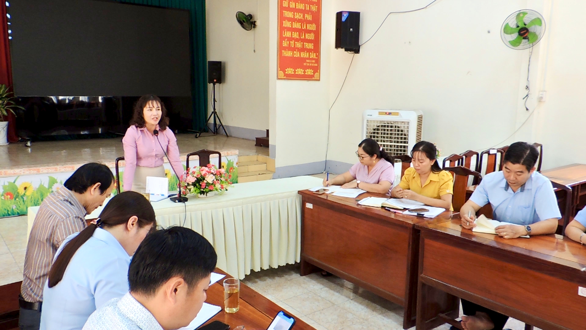 Hình: đồng chí Mạnh Thị Hằng, PCT UBND xã phát biểu tại cuộc họp