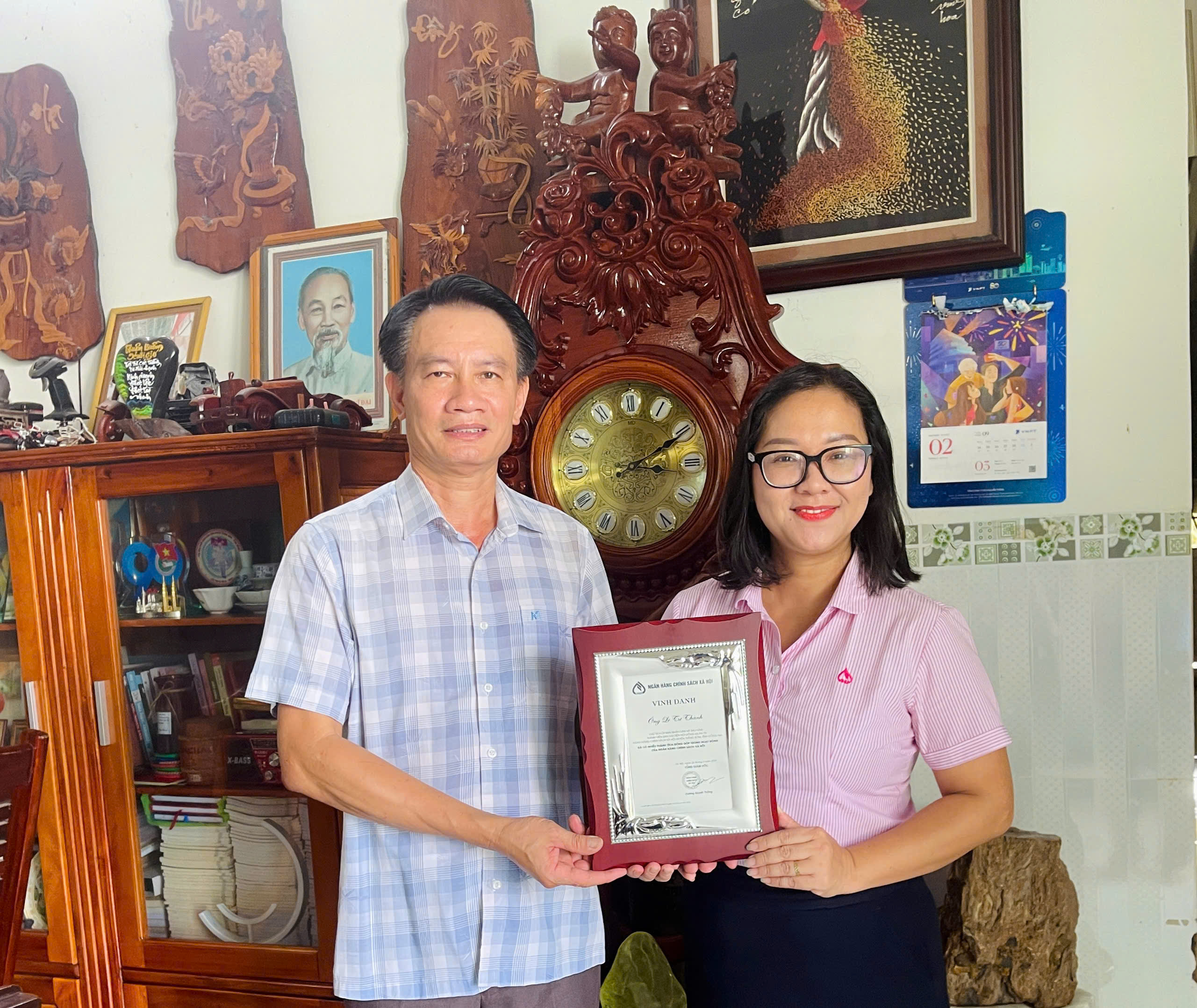 Giám đốc Phòng giao dịch NHCSXH Trảng Bom trao vinh danh của NHCSXH Việt Nam cho ông ông Lê Tư Thành, nguyên Chủ tịch UBND xã Bàu Hàm (cũ), nguyên thành viên Ban đại diện HĐQT NHCSXH huyện Trảng Bom (cũ)